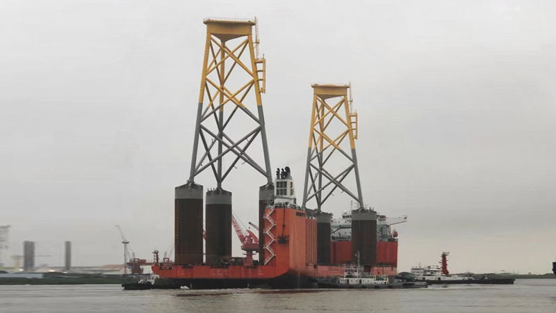 2021年6月17日,由江蘇海新船務(wù)重工有限公司制作的8MW吸力式導(dǎo)管架基礎(chǔ)A12和10MW吸力式導(dǎo)管架基礎(chǔ)A13兩套導(dǎo)管架裝船,綁扎完畢,開往招商重工...