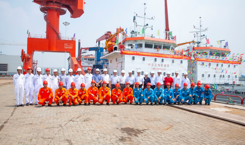 Zhang yan, deputy secretary of haimen development zone; Hou xiaoming, chairman and party secretary of CCCC Shanghai waterway bureau co., LTD., and liu ruoyuan, deputy general manager; Wen tao, party secretary of Shanghai traffic construction general contracting co., LTD., zhou xiantian, general manager; Yao qunmin, director of China classification society nantong office; Sun qingsong, general manager of Shanghai hangsheng ship design co., LTD. Jiangsu haixin shipbuilding heavy industry co., LTD. Chairman, general manager meng xianhong, executive director wu yiwen attended the delivery ceremony. In the presence of all guests, zhou xientian, general manager of Shanghai traffic construction general contracting co., LTD., and meng xianhong, chairman and general manager of jiangsu haixin shipbuilding heavy industry co., LTD., signed the delivery agreement!