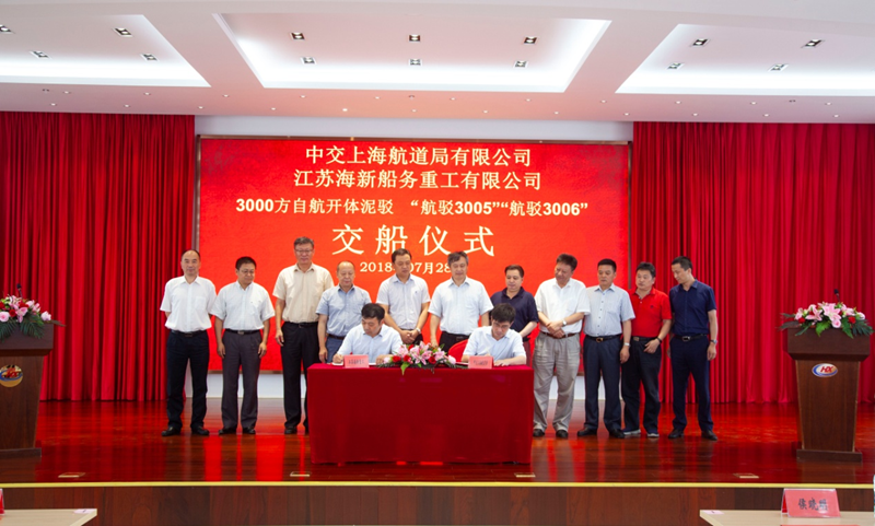 On July 28, 2018, twin 3000m³ self-propellered split hopper barge"Hang Bo3005","Hang Bo 3006" of the CCCC Shanghai Dredging Co.,Ltd. built by Jiangsu Haixin Shipping Heavy Industry Co., LTD. ready to sail ,at the same time also marked the two ship delivered successfully.